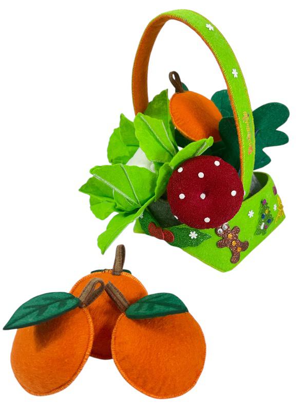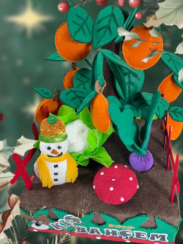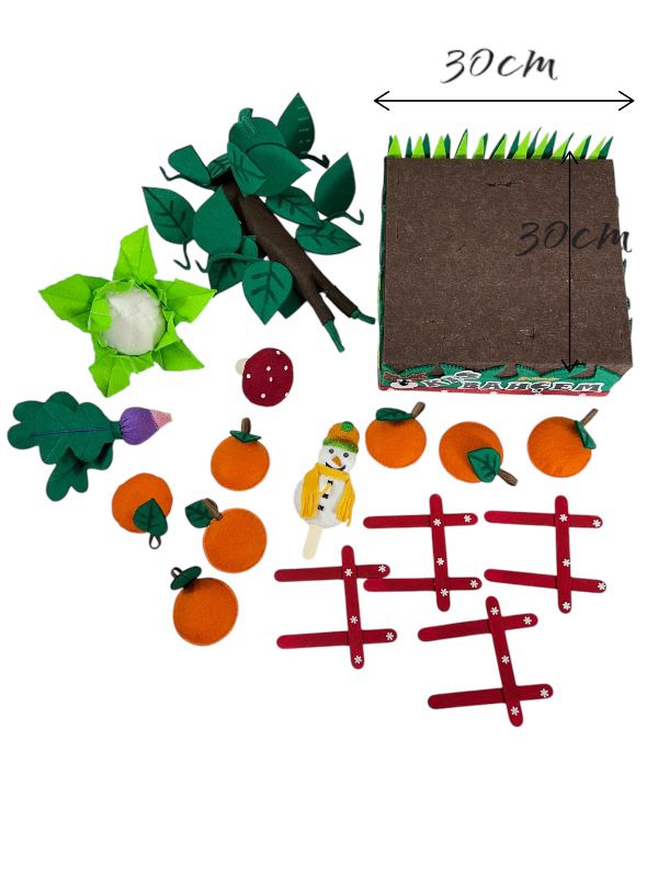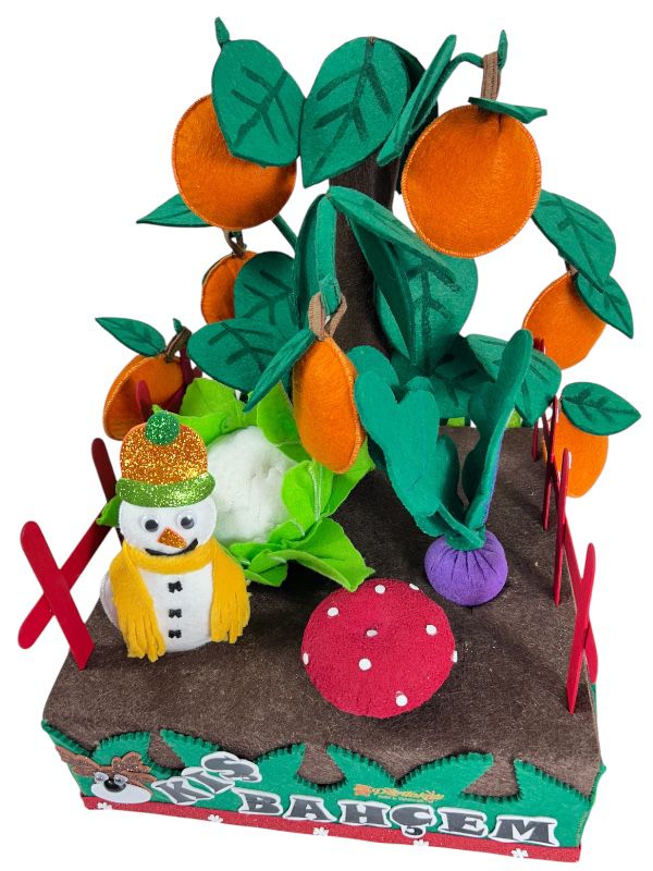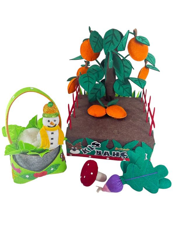Oyuncağın dış kısmı, doğal ve yüksek kaliteli keçe malzemeden yapılmıştır. Kimyasal madde içermez ve çocuklar için güvenlidir. Oyuncak, el yapımı işçilikle titizlikle üretilmiştir. Her bir detay, özenle işlenmiş ve gerçeğine yakın bir tasarım oluşturulmuştur. Güvenli dikiş teknikleri kullanılarak üretilen oyuncak, uzun süre dayanacak şekilde tasarlanmıştır. Deforme olmasını engellemek amaçlı nişasta ile sertleştirilmiştir, yıkandıktan sonra nişastası gidecek yumuşak haline dönecektir. Sonrasında isterseniz çocuğunuz ile beraber nişasta ile sertleştirme yapabilirsiniz, eğlenceli bir aktivite olacaktır. Elde yıkamaya uygundur. 17 parçadan oluşmaktadır(1 adet sebze ekim bahçesi, 4 adet çit, 7 adet portakal, 1 adet portakal ağacı, 1 adet karnabahar, 1 adet mantar, 1 adet turp, 1 adet kardan adam)